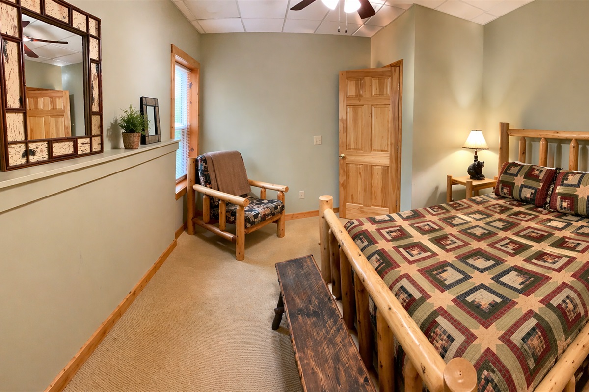 Terrace level has 2 bedroom, & 2 full baths. There is a small living area with a couch and rocking chair. On the lower deck is a hot tub & propane fire pit.